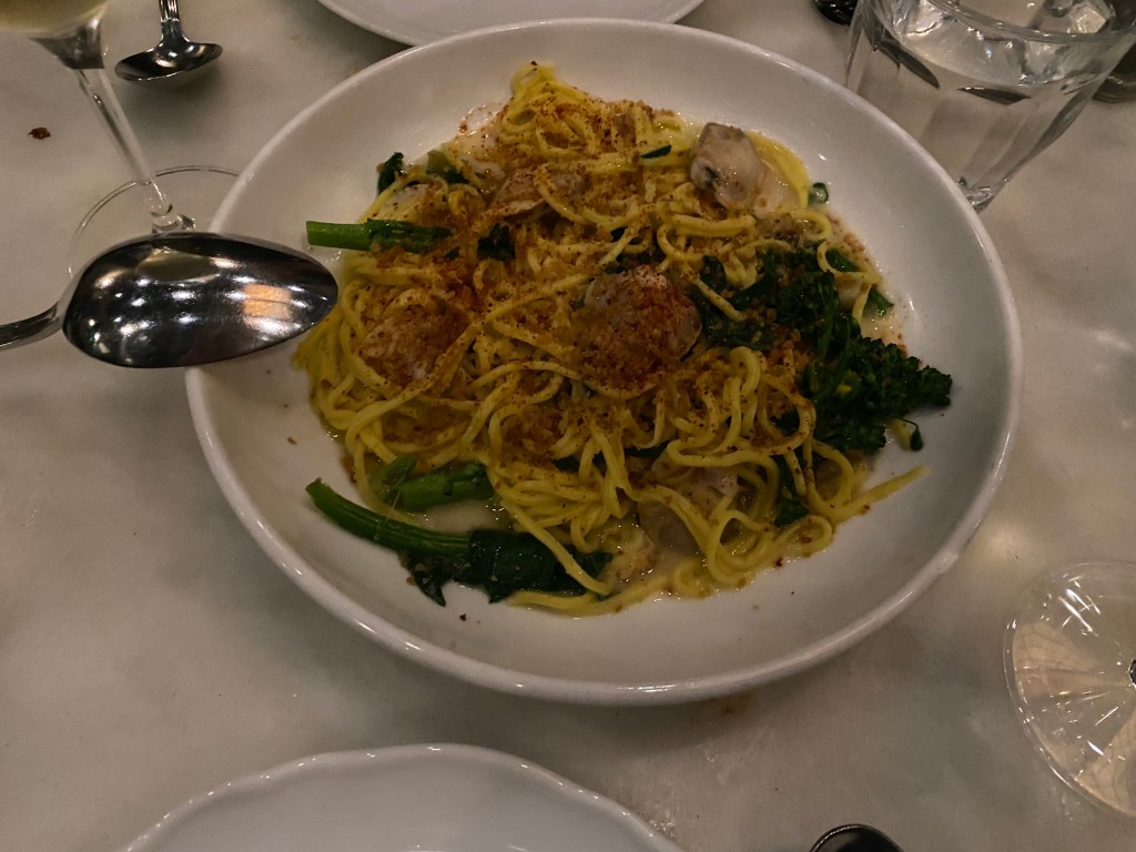 Our first meal in Charleston was dinner at The Ordinary eattheordinary.com . Billed as “a fancy seafood and oyster bar”, this place was anything but ordinary. The joint was bustling when we arrived and didn’t calm down one little bit while we were there. It’s loud and festive and lots of folks go for the fairly obnoxious-in-size seafood towers, but we opted to be a bit refined and ordered several dishes to share. favorites of mine were the Smoked Oysters with Old Bay Saltines and the Clam Spaghetti.