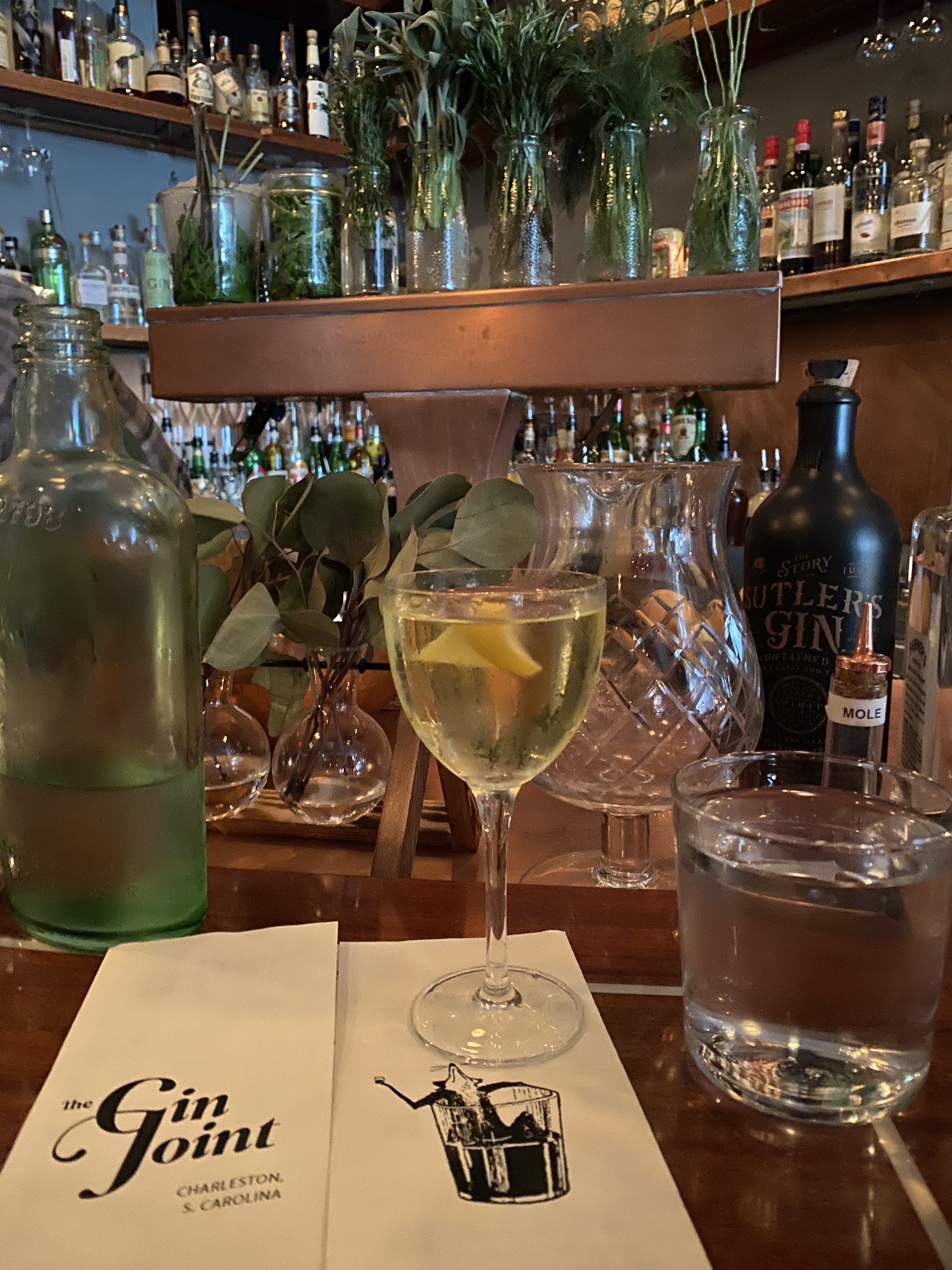 I have two more cocktail bars to mention because both are a must if you too want a significant portion of your visit to Chuck-Town to be on the boozy-jazzy-amazing food side. The Gin Joint http://www.theginjoint.com was hands my favorite, well, gin joint we went to. Dark, narrow, sultry with a mysterious vibe, it checked all the boxes for me. This was EXACTLY what I hoped we find. To make the experience more perfecter, the menu had an option for the Bartender Choice to just make you a cocktail based on two descriptive words…mine were boozy and savory (I got to throw in a third which was “herbal” for free) . The other very exciting cocktail lounge you must know about is Doar Brothers http://www.doarbros.com. This place is so cool BUT make reservations because it is teeny tiny!